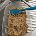 - Voeg daarna eerst de olijfolie toe en daarna langzaam het water. Blijf goed roeren. Je zal merken dat het water heel snel wordt opgenomen en je een plakkerige zaden en pittenmassa krijgt.